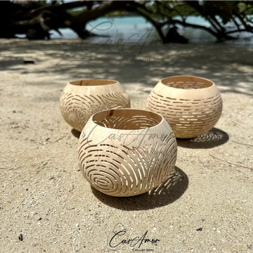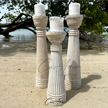 Set of 3 handcrafted exotic wood candlesticks, blending warmth and elegance. Sized at 30 cm, 40 cm and 50 cm, they create a harmonious, natural ambiance in any space.