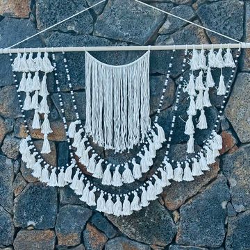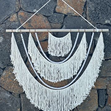Handmade macramé in écru cotton, suspended from natural wooden rod.
