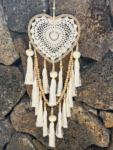 Heart-shaped dreamcatcher in natural tones, adorned with wooden beads for a delicate bohemian touch.