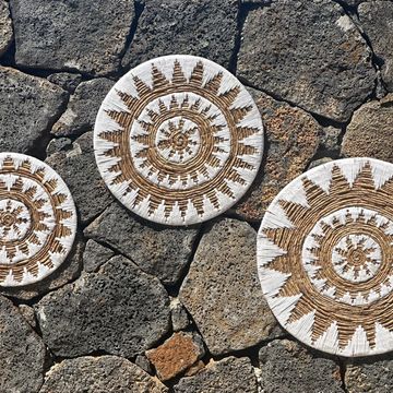 Set of 5 natural mandala wall decor pieces, beautifully crafted to create a serene ambiance.Sizes 45 cm, 40 cm, 33 cm, 30 cm, and 24 cm.