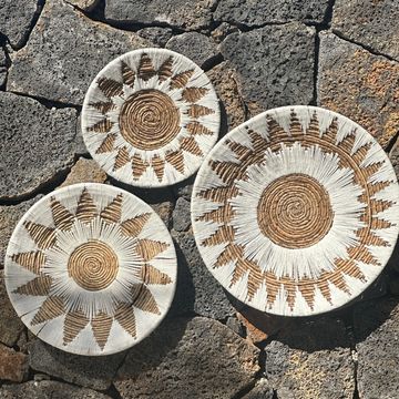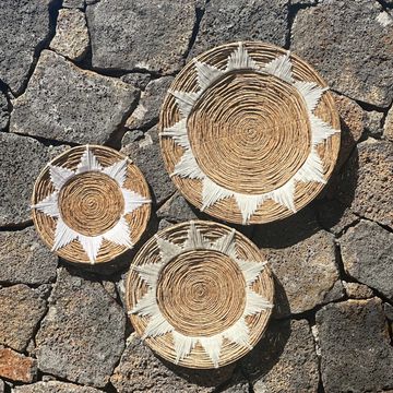 Set of tree decorative baskets crafted from natural leaf weaving, combinig elegance and authenticité.
