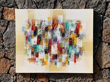 A play of texture, color, and transparency that evokes the fragmented emotions of a world in motion.